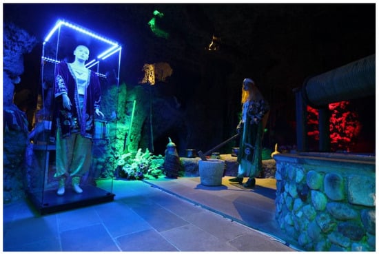 One section of the Service Building that seems designed primarily for vision, and is—perhaps for this reason—the most unique feature of the complex, is the artificial cave in its basement. On one side of the foyer, past the gift shop, one sees a mass of faux rock jutting from the wall, with a dark entryway beckoning (see Figure 2). Stepping down a staircase, the eeriness one feels while descending through the tunnel-like passageway into the mysterious unknown is tempered when one notices the colorful handmade village items bedecking the walls. Reaching the bottom, one finds oneself in a dimly lit museum of the Zöhre Ana cult—the faux rock-walled room housing a sort of ethnographic museum display, with traditional village implements strewn about, some with mannequins in traditional village costume doing traditional village work with them, while other costumed mannequins stand frozen in glass cases (see Figure 3). Combining the otherworldly and the rural-worldly motifs is a traditional-looking well—complete with an unused rope and bucket—which is reportedly an actually dug well, producing water that is supposedly equivalent to the Zamzam water of Mecca, and has its own healing powers. To one side, there is a space where Zöhre Ana, before the larger ceremonial space upstairs was finished, used to meet visitors—her sitting area raised above the floor level, marked with columns and sheepskins. And, as befitting a sacred space, there is a niche in the cave wall for votive candles to be lit.