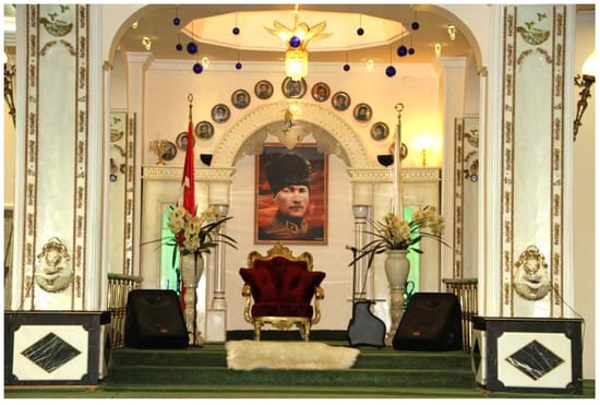 For an illustration of how Zöhre Ana is highlighted in the cultic arrangement we can look to how she is positioned in the ritual space. She naturally assumes a place of distinction, separated and marked off from the rest of the space in several ways. Her place in the Grand Visitor Hall is within an ornate recess like a church sanctuary within the wall opposite the door, with the length of the room leading the eye up to it (see Figure 4). Her seating area is raised two steps above the floor of the room, and at the center of it is an elaborate armchair with a sheepskin at its foot, and this is where Zöhre Ana sits.9 The chair is flanked by flags and vases of flowers, and behind it is a niche from which looks out a portrait of Atatürk, its arch lined with pictures of the Twelve Imams.