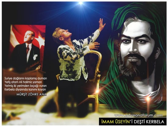 Also frequently superimposed on her photographs are images of Ali. The Alevis share much of their cosmology with other forms of Shi‘i Islam—the name Alevi itself derives from that of Ali—so the Zöhre Ana cult follows this inclination by featuring images of Ali, Hasan and Hüseyin, the Twelve Imams, and the Ehl-i Beyt in its iconography, and quite often these are combined with those of Zöhre Ana, linking her to them cosmologically. Ali is naturally the prime figure in this aspect; his image is on the cover of her third book, which is titled Ali Pirimdir Yolu Bizimdir (“Ali Is My Pir, His Way Is Ours”), and appears at the top of her website’s homepage, along with the motto Hz. Ali’siz Yol Yürünmez (“The Way Is Not Walked Without Ali”); the same motto also constitutes the name of her Instagram account. Along with Ali, Hüseyin—in Zöhre Ana orthography, Üseyin—is frequently portrayed, and his martyrdom in Kerbela is commemorated every year with a fast, though not coinciding with the Islamic month of Muharrem but rather always in the first half of March.