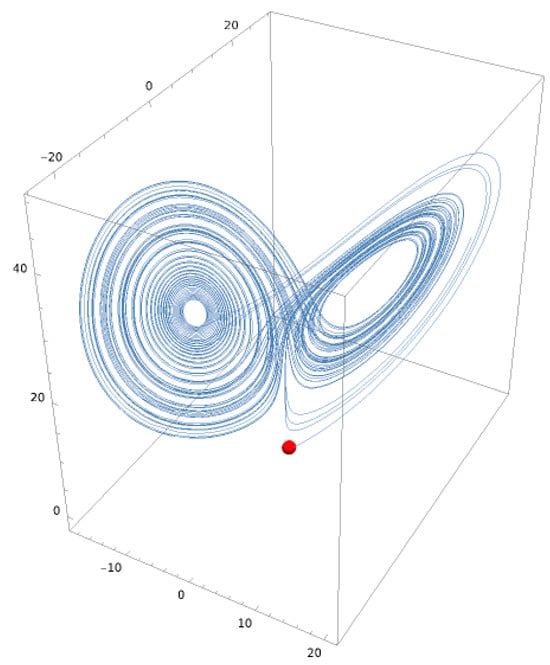 | 44 | Image taken from https://demonstrations.wolfram.com/LorenzEquationsSensitiveDependenceOnInitialConditions/ (accessed on 10 December 2024). Note that the two-dimensional image does not accurately portray the three-dimensional attractor, whose chaotic trajectory never actually overlaps. |