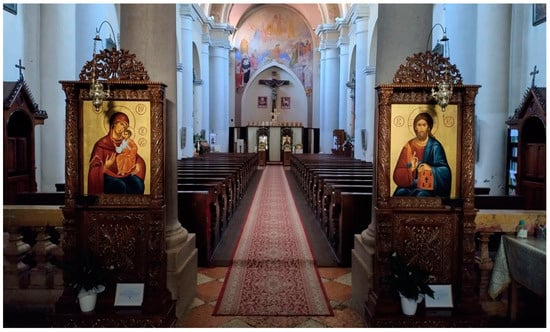 Converting a Catholic church to the liturgical use of an Orthodox one without altering its original state entails several challenges. First of all, not all catholic churches are a viable option, as some are adorned with iconographic solutions that would be unacceptable in Orthodoxy. Second, the new furnishing and icons must be removable (Figure 1), such as the iconostasis that divides the altar from the naos (which corresponds to the nave), a customary element in Orthodox sacred architecture: