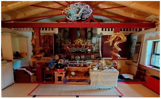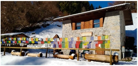 The Tenryuzanji (which means “Temple of the Mountain of the Heavenly Dragon” in Japanese) Buddhist temple is now an established reality in the Molin Valley. Following the purchase, renovation and conversion of two farmsteads—maso in Italian, a typical rural dwelling of the Oriental Italian Alps—in the municipality of Cinte Tesino in the mid-2000s, a martial arts school was also founded, which contributes to the popularity of the place and welcomes students from different parts of Italy. This case study exemplifies heritage conversion from a rural, alpine architecture to a Buddhist temple (Figure 2 and Figure 3). As for the former case, the facade and external design was maintained, while changes were applied to the interiors.