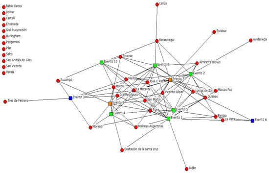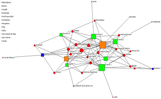 In contrast, events such as the “Inauguration of the interfaith mural” (Event 6) and the “Preparatory meeting for the pilgrimage to Luján” (Event 3), with lower centrality values (0.08 and 0.18, respectively), present a more limited scope within the network. These events, of a more specific or symbolic nature, mainly involved a reduced group of municipalities whose participation was linked to particular thematic interests or specific responsibilities. However, these activities allow us to identify another relational dynamic, in which events of a lesser centrality could articulate local networks and/or strengthen the identities of the actors involved.