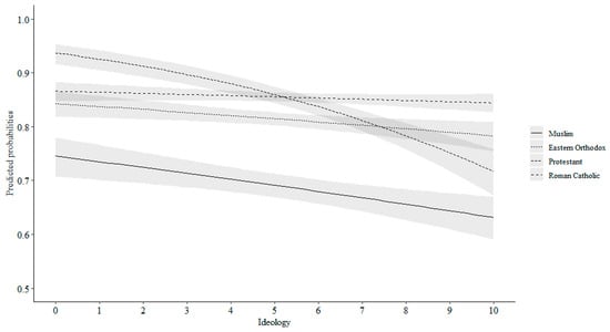 A clear trend emerges among Muslim respondents, who consistently exhibit the lowest predicted probability of experiencing climate anxiety across the ideological spectrum. Even among individuals with left-leaning ideological orientations, where concern for climate issues is generally higher, the probability of climate anxiety among Muslims remains relatively subdued. Furthermore, this probability gradually decreases as ideological orientation becomes more right-wing-oriented. This finding suggests that factors beyond political ideology—such as cultural or religious teachings—may play a more substantial role in shaping perceptions of climate risk for Muslim respondents. In stark contrast, Protestants display the highest levels of climate anxiety at the leftmost end of the ideological spectrum. However, their predicted probabilities decline sharply as the ideological position moves to the right side of the spectrum. This steep drop highlights a stronger relationship between right-leaning ideology and lower climate anxiety within the Protestant group, a pattern that aligns with previous findings linking right-wing political ideology to diminished concern for environmental issues. The pronounced decline among Protestants suggests that political ideology exerts a powerful influence on their perceptions of climate risk, overshadowing any moderating effects that religion might have. Eastern Orthodox Christians and Roman Catholics, on the other hand, display more stable levels of predicted climate anxiety across the ideological spectrum. While both groups experience a slight decline in predicted probabilities as individuals become more right-wing oriented ideologically, this decrease is far less pronounced than Protestants. This relative stability suggests that their religious frameworks or institutional teachings may act as a buffer, tempering the influence of ideology on climate anxiety. These groups’ moderate and consistent probabilities reflect a more balanced interaction between religion and political orientation. The confidence intervals depicted in the graph further support these interpretations. Although differences between denominations are statistically meaningful, there is some overlap between Eastern Orthodox Christians, Protestants, and Roman Catholics, particularly around the mid-range of the ideological spectrum. This overlap implies that, while ideological polarisation is evident—particularly among Protestants—shared religious or cultural factors still contribute to similarities in climate anxiety levels among certain groups.