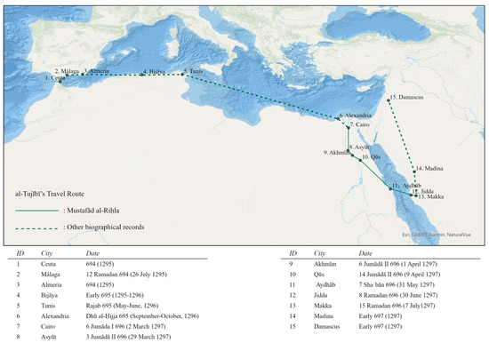As only a portion of Mustafād al-Riḥla has survived, detailed records of al-Tujībī’s complete itinerary are unavailable. Consequently, reconstructing his full travel route presents significant challenges. Nevertheless, both al-Tujībī’s own accounts in Mustafād al-Riḥla and Barnāmaj, which reference the cities he visited beyond Egypt and Ḥijāz, along with other biographical records discussed in the previous section, provide a basis for making certain inferences on his travel route (Figure 1). Mustafād al-Riḥla offers a detailed account of al-Tujībī’s travels from Cairo to Makka. However, for information regarding his route from Ceuta to Cairo and his return from Makka to his hometown, reliance must be placed on the other biographical records. As previously noted, Aḥmad Bābā Al-Tinbuktī (2000, p. 362) recorded that al-Tujībī embarked on a journey from Ceuta, traveling first to al-Andalus before heading East. Al-Tujībī himself, in his Barnāmaj, mentions his presence in Málaga (Mālaka), one of the major cities of al-Andalus, on 12 Ramadan 694 (26 July 1295) (Al-Tujībī 1981, pp. 145–46) and elsewhere, he references his scholarly activities in this city (Al-Tujībī 1981, pp. 59, 236, 268). In another passage of Barnāmaj, he is found continuing his studies in Almería (al-Mariyya) (Al-Tujībī 1981, p. 47). These records corroborate al-Tinbuktī’s narrative that al-Tujībī traveled from Ceute to al-Andalus. After al-Andalus, al-Tujībī appears in Bijāya, located in the central Maghrib, in early 695/1295–1296. According to his records, he was in Bijāya between Muharram and Rabīʿ I (November 1295 to February 1296) for scholarly pursuits (Al-Tujībī 1975, pp. 65, 128, 449; 1981, pp. 110, 134). Subsequently, he traveled to Tunis in the month of Rajab (May–June, 1296) (Al-Tujībī 1975, pp. 257, 286, 331; 1981, p. 165) and then to Alexandria in Dhū al-Ḥijja (September–October, 1296) of the same year (Al-Tujībī 1981, p. 145; Al-Tinbuktī 2000, p. 413).