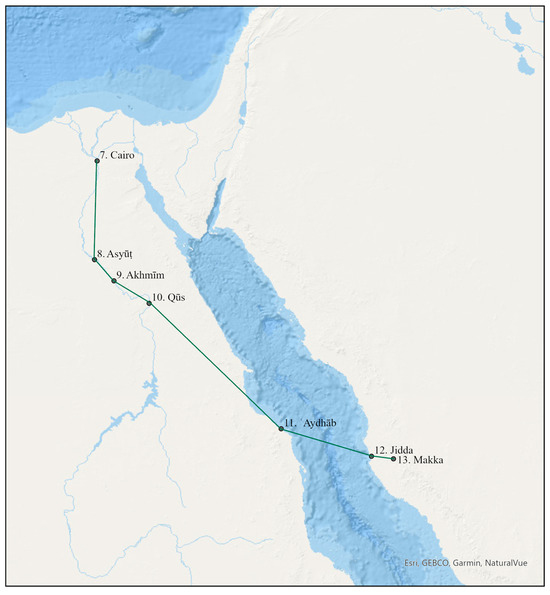 According to the records in the surviving fragment of Mustafād al-Riḥla, al-Tujībī arrived in Cairo on 6 Jumāda I 696 (2 March 1297) (Al-Tujībī 1975, p. 20). Departing from Cairo, he reached first Asyūṭ in Upper Egypt on 3 Jumādā II (29 March), then Akhmīm on 6 Jumādā II (1 April) and Qūṣ on 14 Jumādā II (9 April) (Al-Tujībī 1975, pp. 169–73). Approximately one month after leaving Qūṣ and enduring a challenging desert crossing, he arrived at ʿAydhāb, the Egyptian port city on the Red Sea, on 7 Shaʿbān 696 (31 May 1297) (Al-Tujībī 1975, p. 205). On 13 Shaʿbān 696 (6 June 1297), two dhows (sunbūk) set sail for Jidda, the major port of Ḥijāz. However, al-Tujībī’s vessel encountered a severe storm and was forced to return to a port south of ʿAydhāb. After surviving the white-knuckle sea experience, the pilgrimage group requested a new dhow from ʿAydhāb, and eventually, al-Tujībī was able to reach Jidda with this new vessel on 8 Ramadan 696 (30 June 1297) (Al-Tujībī 1975, pp. 208–18). Following a week-long journey from Jidda, he entered Makka in the middle of the month of Ramadan and remained there until the eighth day of Dhū al-Ḥijja (27 September 1297) (Al-Tujībī 1975, p. 468). Thus, the records in the surviving portion of his travelogue indicate that al-Tujībī’s pilgrimage journey from Cairo to Makka (Figure 2) lasted approximately seven months, spanning from 6 Jumādā I (2 March) to 8 Dhū al-Ḥijja (27 September).