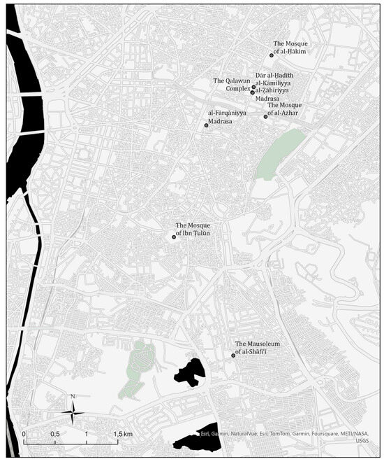 While describing the religious and educational institutions in Cairo (Figure 3), Al-Tujībī (1975, pp. 4–7) highlights the architectural patronage of the Ayyubid and Mamluk sultans, as well as the military elite, who commissioned magnificent buildings throughout the city. He notes that rulers such as al-Ṣāliḥ Najm al-Dīn Ayyūb (r. 1240–1249) and many other amīrs constructed monumental mausoleums, staffed them with guards and Qurʾan reciters and provided them with generous endowments. Among these, he particularly praises the Qalāwūn complex, which comprises a hospital (bīmāristān), mausoleum and madrasa, and identifies the Bayn al-Qaṣrayn area—where this complex is situated—as the most prosperous district of Cairo. Al-Tujībī provides an account of the numerous madrasas and mausoleums lining both sides of al-Muʿizz Street, which extends from the city’s northern gate (Bāb al-Futūḥ) to its southern gate (Bāb al-Zuwayla). He further remarks on the two major mosques in the city, the Mosque of al-Ḥākim and the Mosque of al-Azhar, recording their founders and dates of construction. Subsequently, al-Tujībī headed south of Cairo and visited the Mosque of Ibn Tulun. He presents a detailed description of the construction activities in this mosque, which was being restored by the Mamluk sultan al-Mansūr Lajin (r. 1296–1299) during his visit, and of the sultan’s endowments for the mosque.4 Following about ten pages of observations on Cairo, al-Tujībī moves on to the muʿjam section of his book, where he introduces the scholars he met in the city.
