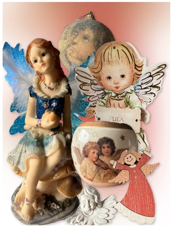 Particularly interesting are the “genetic” connections of various angelic forms in popular culture: Christian beliefs and their representations coexist with pre-Christian myths and fairy tales from various parts of the world. Religious symbolism coexists with secular embellishments. Sometimes, the connections are much deeper and more dramatic—one image may be a hybrid of these different representations15. These forms create an iconography that includes both the guardian angel from religious pictures given to children for baptism, during religious lessons, or as a souvenir of the traditional “carol service”; various forms of secular “angelic” figures with ambiguous meaning and symbolism (Figure 1); as well as mischievous little angels (which seem to be hybrids of elves and cupids).