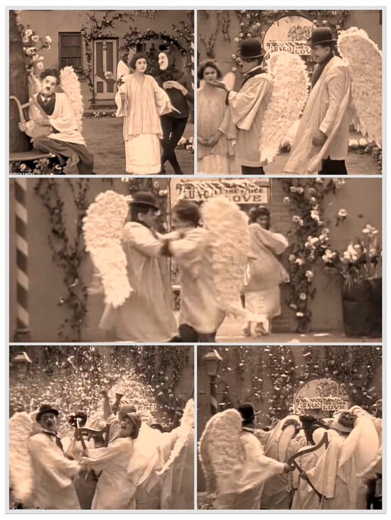 Let us focus for a moment on the film The Kid, in which the portrayal of heaven seems to serve as a model for later productions. The protagonist of the film dreams that he went to Dreamland, where, in the appropriate store, he purchases accessories such as wings and a palm tree (well, even in heaven, nothing is free, illustrating the expansion of consumer society, the consumer lifestyle and consumer practices that transcend worlds). Heaven does not seem very different from his everyday life: our hero lives in a poor neighborhood and meets the same neighbors and children, as well as familiar policemen. The atmosphere is decidedly non-metropolitan, non-urban—idyllic and pleasant. However, this paradise is disrupted when the devil, also traditionally depicted (horns, tail and a black outfit), breaks in and attempts to convince citizens to partake in evil, bringing along temptations, seduction and jealousy (Figure 5). The evil one manages to cause conflicts, including a fight, during which angelic feathers fall from his wings, finally concluding happily when the dream breaks. Heaven is dull; it is associated with passivity; and as Alexis de Tocqueville suggested, a democratic society such as in the U.S. should fear passivity and weakness in its citizens (de Tocqueville 2006, vol. 2). One may wonder to what extent the fear of passivity or inaction is inherent in the American ethos, or whether it is typical of capitalist societies in the productive stage of development. In consumer societies, citizen passivity is the order of the day (cf. Barber 2007, passim; Fromm 1968, p. 123; Schor 2004). However, such a vision of paradise is resented there as well.