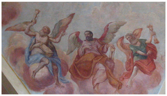 An unusual depiction, then, are the above angels, painted on the vault in the church of the Jesuit Fathers in Kalisz (Figure 6). Here, the gender is very clearly marked, the bearded angels carry the word of God along with other intercessors of the Lord—apostles and saints.