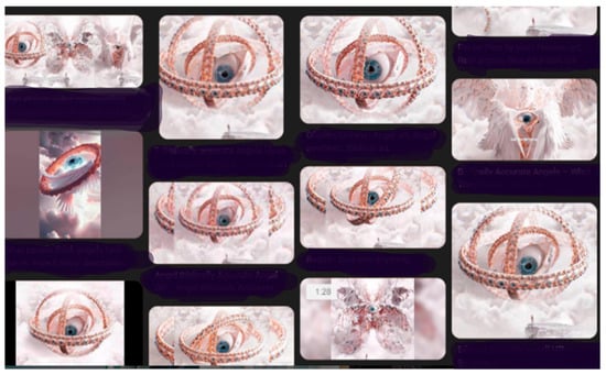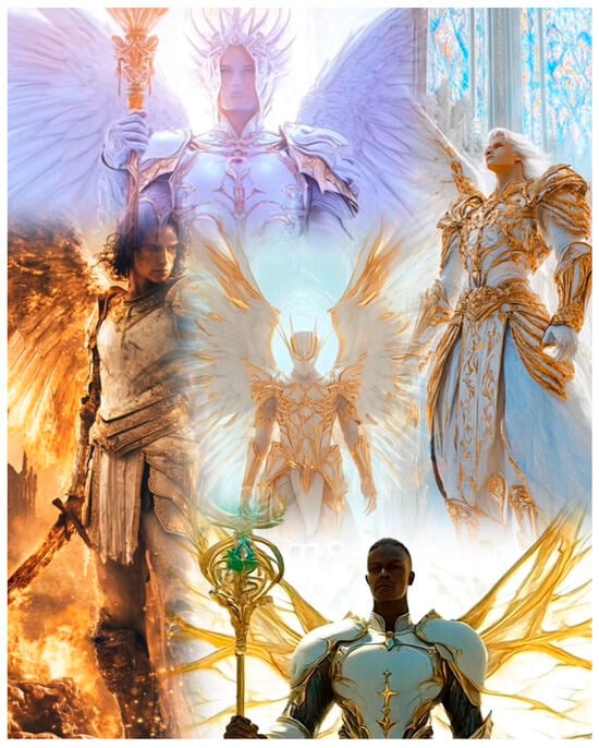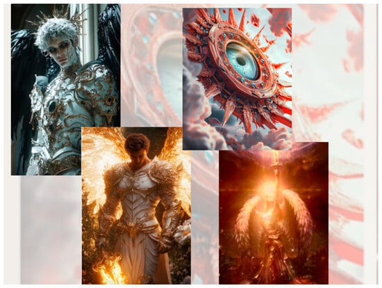 ”)—often thankful (people thank God without specifying for what specifically; in others, they give thanks for faith, for Jesus Christ, for angels, etc.); (2) provocative—for example, attributing beauty to demons (a comment on the series of beautiful, named angels), or “oh so Angels also wear clothes?”, evoking the second commandment “tu ne te feras point de représentation quelconque des choses qui sont en haut des le ciel37”; (3) perfunctory—“amen”, “Michael”, “beautiful” and “God is wonderful”; (4) questioning—“Which is my guardian?”; “Mais qui vous a dit que cet créatures ont cette forme mes frère. Arrêtez de vous faireembrouillé ainsi38.”; and (5) claiming—“if you believe in God, Jesus Christ—text affirm (AMEN) to my inbox now to receive a big blessing to pay up ur rent and bills E.T.C.” (this comment is not from the person posting the material online). Although these clips generate extensive commentary, not all viewers leave a trace of their feelings or their thoughts in the comments. The impact in popular consciousness of such AI-created narratives requires long-term and multifaceted research. It is worth remembering that AI introduced to create web content is still in the learning stage; and is burdened with many biases—gender (Walsh 2017, pp. 161–162), racial39 and cultural (Jarecka and Fortuna 2022). Is AI also burdened by religious biases? This is an interesting topic, worthy of separate studies.What does the Bible really say about angels? This question is addressed in numerous clips presented on YouTube, TikTok and sometimes Instagram. Instead of sweet childlike figures or feminine, smooth and mysterious, warm angel-ladies based on imagery from the 19th century (Figure 7), as noted by C.S. Lewis, the imaginarium offers male figures in armor as God’s warriors (Figure 8 and Figure 9), or frightening figures—hybrids blending elements from the human world, the animal kingdom and the fantasy realm of horror movies. And, what is more important, some of these new types of angels are depicted as only eyes, or mechanical constructions based on circles, built from eyes and feathers/wings. They are present on the internet thanks to AI. This represents a new medium of creation, where “everything” is possible due to the development of new technologies driven by algorithms and applications based on textual descriptions. Colors play a significant role in this angelic imaginarium—some images (videos) are mostly white, and some accents of color are connected with structures like eyes or human silhouettes, elements of horses, etc. Gold—as a symbol of heavenly origin—is typical for the images of Archangel Michael, Gabriel or angels who still belong to God’s Kingdom. Dark colors like black are often associated with apocalyptic imagery, regardless of whether the angels are good or fallen (Figure 10).
