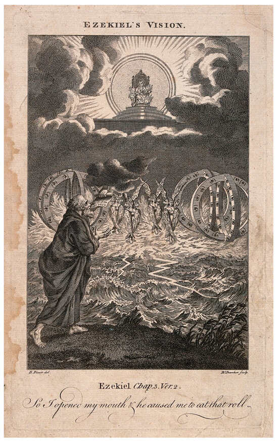 This kind of visualization is rooted in historical drawings, such as the above from the 18th century by R. Pranker after B. Picart. Visualizing Ezekiel’s vision is a challenge for every artist (Figure 12). Here is an excerpt of its mention in the Bible: “Now as I looked at the living creatures, behold, a wheel was on the earth beside each living creature with its four faces. The appearance of the wheels and their workings was like the color of beryl, and all four had the same likeness. The appearance of their workings was, as it were, a wheel in the middle of a wheel. When they moved, they went toward any one of four directions; they did not turn aside when they went. As for their rims, they were so high they were awesome; and their rims were full of eyes, all around the four of them. When the living creatures went, the wheels went beside them; and when the living creatures were lifted up from the earth, the wheels were lifted up. Wherever the spirit wanted to go, they went, because there the spirit went; and the wheels were lifted together with them, for the spirit of the [d]living creatures was in the wheels. When those went, these went; when those stood, these stood; and when those were lifted up from the earth, the wheels were lifted up together with them, for the spirit of the [e]living creatures was in the wheels” (Ezekiel 1: 15–21).
