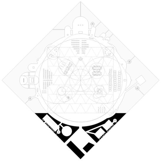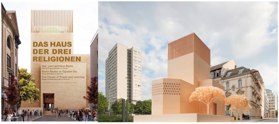 Another project that can be remembered here, proposed as an operational reality—and currently under construction in the city of Berlin—is known as “The House of One”. This project proposes three temples—a synagogue, a church and a mosque—isolated from one another and only connected by a large, external space that all three share, under the motto, “Three religions. One house. Four rooms” (). The initiative dates from 2001, in the heart of the Protestant community of St. Petri-St. Marien, which was joined by Berlin’s Jewish community, the rabbinical seminary Abraham-Geiger-Kolleg and the Muslim initiative for interreligious dialogue Forum Dialog e.V. In 2012, the project was opened up to an international architectural competition that was won by the Berlin-based architectural studio Kuehn Malvezzi, founded by Simona Malvezzi, Wilfried Kuehn and Johannes Kuehn (Figure 30).