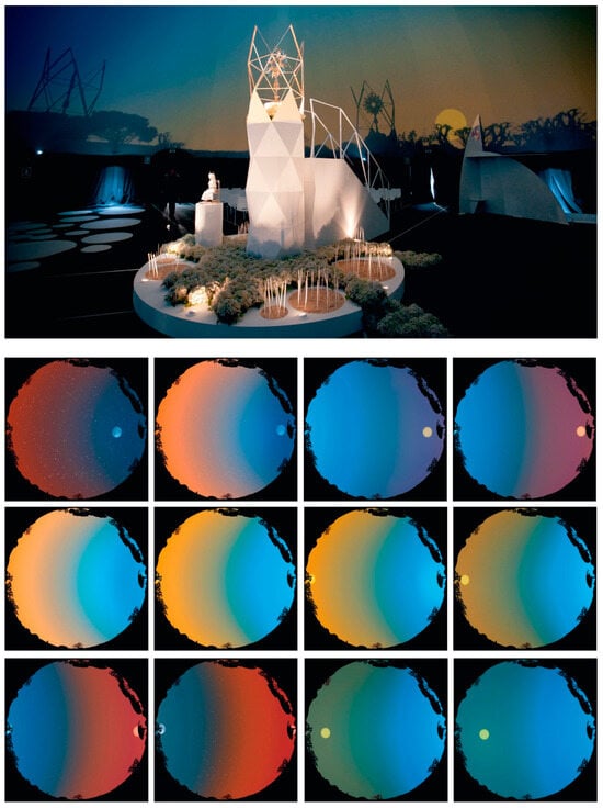 A similar strategy was devised as part of a project designed with the visual artist Javier Viver for an ephemeral chapel at the Feast of the Holy Family in Madrid (2012). On that occasion, the novelty of a mobile altarpiece was introduced by using a projection on a hemispherical cinema screen. However, this movement was imperceptible—just like the passing of time in the hands of a clock—a movement that imitated the solar cycle—from dawn to dusk and the passing of night until a new dawn—in barely seven minutes (Figure 24).