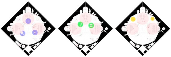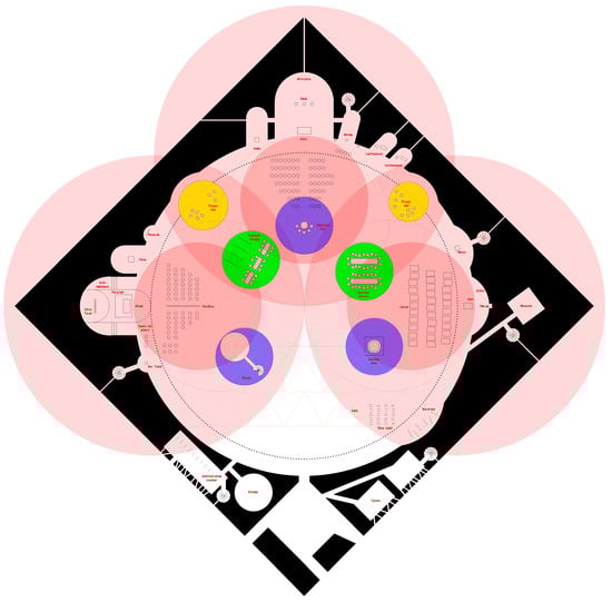 Other possible spaces for encounters would be the areas related to water, which have different nuances in each religion but share a common character: the Jewish Mikveh and the Muslim Sabil, both oriented to ablutions or purification baths, together with the Baptismal font, which has an initiatory function for Christians, are part of a somewhat healing program. These three spaces are close to the geometric center of the ground plan, once again with the aim of achieving a rapprochement between practices that are profoundly human and, therefore, common to all (Figure 28).