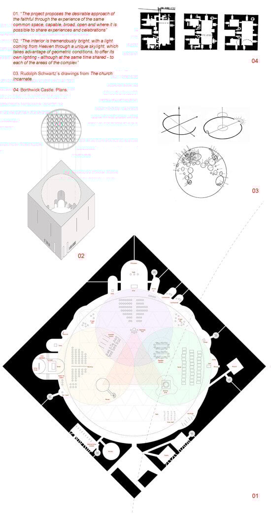 Reading these words of Luther King leads immediately to a yearning, the desire for a peaceful world that knows how to coexist with those who are different. But this idea contrasts sharply with the reality that comes to us every day. Perhaps the first step could be taken in the world of religions. From this reflection and this will is born this project of a multi-faith chapel, a shared space between Jews, Christians and Muslims (Figure 1, Figure 2, Figure 3 and Figure 4).