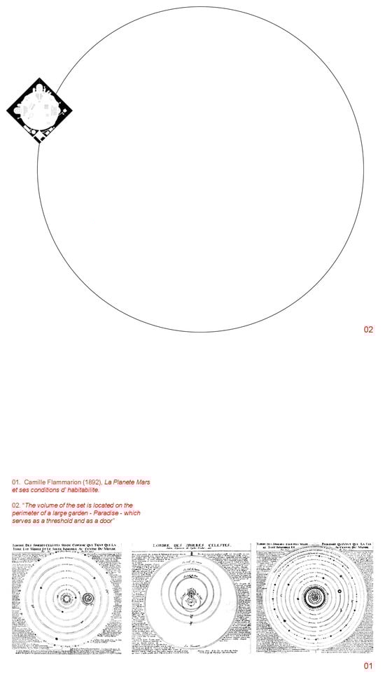 The volume is symbolically understood as immersed in a sort of circular, geographical orbit that evokes both the inside and outside of paradise, of coexistence with God. The volume—this space that aims to be multi-confessional—can be also considered a boundary between those who seek God, knowingly or not, and those who have found God and would dwell in the paradise envisaged as a walled garden (Figure 7).