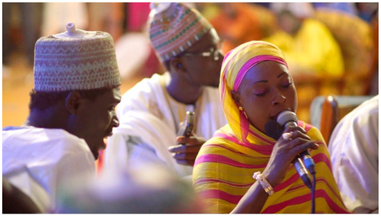 In contrast to acting as a holy woman or spiritual guide, which may not require exposing oneself to public eyes and ears, performing dhikr in the Fayḍa’s public gatherings involves potential contradictions. Many of my interlocutors mentioned the prevalent saying that “the woman’s voice is ʿawra” (Hill 2018, chap. 6), a notion found in other parts of the Muslim world as well (see, for example, Muazu 2022). Several authoritative Tijānī manuals mention the teaching explicitly. The most widely read manual, Bughyat al-Mustafīd [“Desiring the beneficial”], declares that a woman’s “voice is ʿawra, and it may be temptation [fitna]” (Al-Sāʾiḥ 1973, pp. 415–16; see Naẓīfī 1984, p. 211; Sukayrij [1900] n.d. for almost identical explanations). Accordingly, it instructs men to recite the group litany (waẓīfa, lit. “assignment”) aloud yet instructs women to recite it quietly enough that only someone sitting next to them can hear them. Shaykh Ibrāhīm applied this principle to religious gatherings more generally, with the few exceptions mentioned above.
