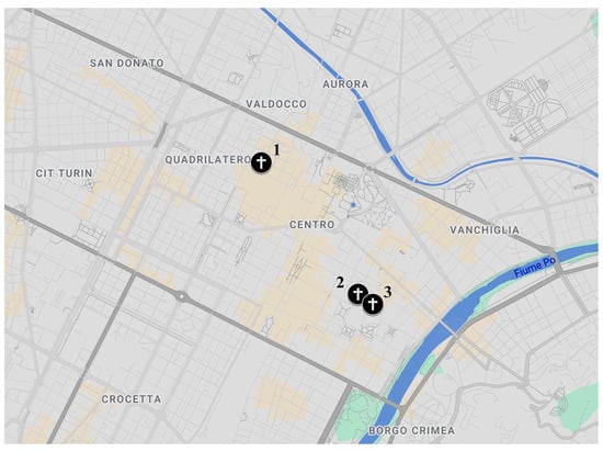 Cozma and Giorda 2022). Located in Moncalieri, approximately 300 m from the Turin border, it is the largest Romanian Orthodox church in the southern quadrant of the city. Its location and distinctive architecture are clearly visible and recognizable from the outside, serving both the local and greater Turin populations; for this reason, it is included in the count. It is not surprising that “the first Romanian Orthodox church built ex novo arose in the Turin area (…) if one thinks of the innovations concerning the management of religions that this city has experienced and still experiences” (