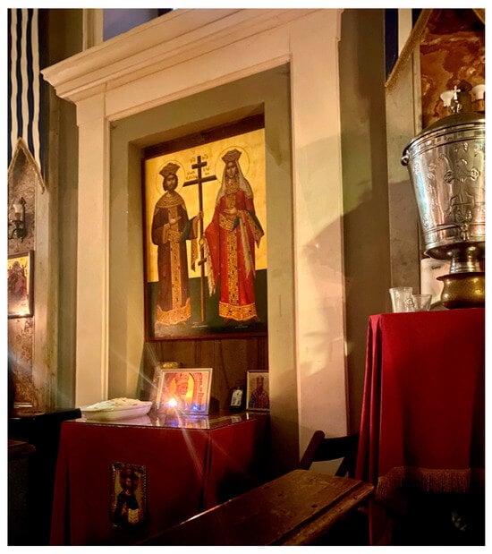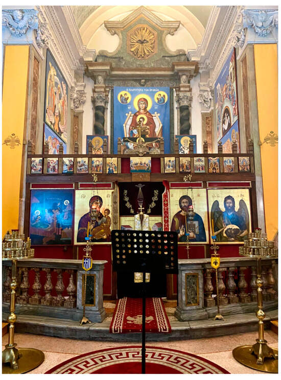 The sociological and ethnographic framing was facilitated by field research, which included two semi-structured interviews with the Greek parish priest (February 2024 and October 2024) and informal conversations with church members during the site visit. The observation focused particularly on the primary liturgies, events, and rituals in order to capture both the material and immaterial dimensions of the community’s religious heritage.