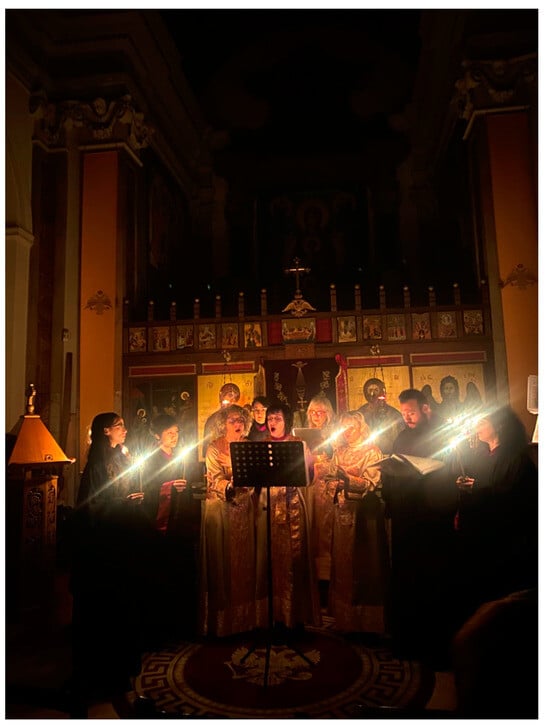 Fr. Restagno 2024, 10 February). The use of the Greek in the liturgy aims to preserve a heritage that is simultaneously religious, cultural, and national. The sung Greek is the classical language of the Bible, and Byzantine music, with its ancient roots, is pre-Gregorian, modal, and non-tonal, relying on natural scales rather than the tempered ones of Western music. This type of musical experience, accompanied by Greek language, serves as a cultural, spiritual, and mystical bridge, connecting peoples across centuries, from antiquity to present day.
