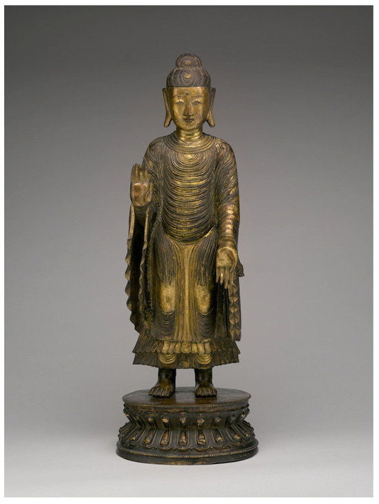 What brings Daoxuan’s Records closer to our modern sensibility is its explicit foregrounding of Buddha statues as art objects with their material and formal properties. A Buddhist statue, as we gather from the text, consists of an icon proper, a base, and a mandorla (T52:414a; 415b). The text also specifies, in some cases, the material medium of the statue: bronze (T52:419c), sandalwood (T52:418c), cliffside excavation (T52:417c), etc. Occasionally, the catalog even identifies the sculptors, such as Dai Kui (ca. 331–396) and Dai Yong (ca. 377–441) (T52:416c; 421a). It also specifies the production methods, such as the sculptural production of a statue based on a drawing of a statue elsewhere (T52:414c). However, these properties matter less than the core dynamic governing the exalted list of fifty storied images.