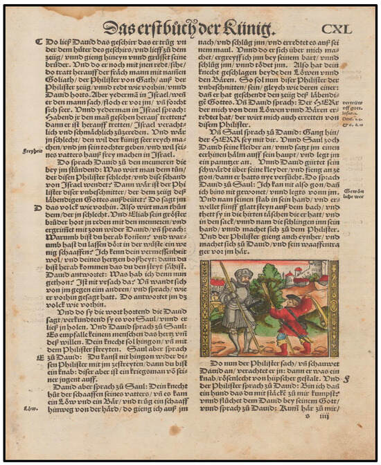 The Israelite shepherd-warrior David faces Goliath in I Samuel 17, who is dressed in costly and protective Maximillian-style armor, characteristic of nobility. Drafted by Hans Holbein the Younger, woodcut by Veit Specklin. Accessed on 6 September 2023. https://www.e-rara.ch/zuz/content/zoom/1929502.