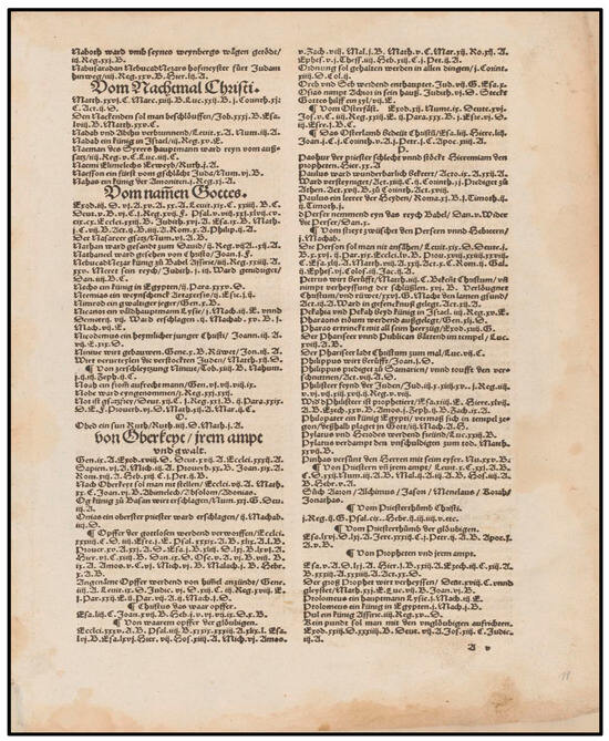 In the 1531 Zurich Bible, thirteen pages of commonplaces were organized according to fifty-three major topics, marked in bold, along with numerous subcategories (Figure 4).16 They ranged from where to find scriptural guidance on the imminently practical issues in early modern society, e.g., loans, theft, gossip, work, hospitality, sex, old age, the conduct of family life, etc., to scriptural reflections on the abstract, the moral, and the ethical, e.g., hardships, temptations, humility, forgiveness, and obedience, etc. While these commonplace topics were readily found in the late medieval German Bible, here they organized passages that supported Reformed Covenant theology, historical memory, and their prescriptions for an ideal relationship between the church and temporal authority.
