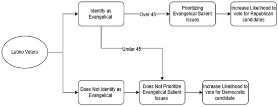 As illustrated in Figure 1, the overarching theory posited here aligns with existing literature: the majority of Latinos are more inclined to support the Democratic candidate, as Democrats are generally perceived as better representing Latino interests. However, the model also suggests that Latino Evangelicals are more likely to vote for the Republican candidate whose platform aligns more closely with Evangelical priorities. Crucially, this relationship is moderated by age, with Evangelical identity having little to no significant impact on political behavior among younger Latinos. Thus, this paper posits the following theory, also visually represented in Figure 1: Latino non-Evangelicals will prioritize Latino-centric issues when casting their votes (De la Garza and Cortina 2007; Barreto 2007b; Barreto et al. 2010), whereas Latino Evangelicals will be more likely to prioritize issues central to Evangelical ideology. However, this effect is mitigated by age, as younger Latino Evangelicals exhibit political behavior that is more similar to their non-Evangelical co-ethnics.