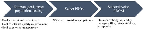 For this study, we followed the first three steps of the PROM cycle as described by Verkerk et al. (2017). The steps are displayed in Figure 1. The first step is to determine the goal, target population, and setting of the PROM. The second step is to select the outcomes that need to be assessed. The third step consists of determining the criteria for the PROM, selecting and/or developing instruments, determining the validity, reliability, manageability, interpretability, and acceptance of the PROM, and planning the test phase.