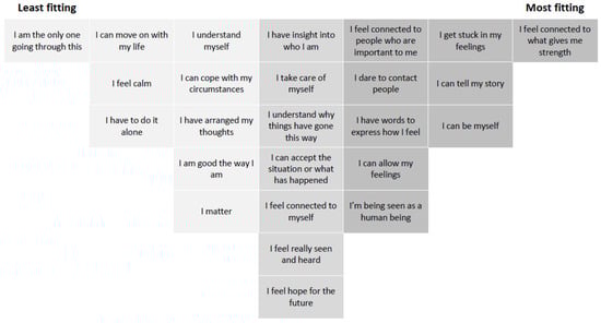 Based on this evaluation, a timeframe of the past three days (the day before yesterday, yesterday, and today) was added to the prompt. This allows for a more stable evaluation of the state of the person, but also one that closely reflects the current state. The participants were able to complete the sorting task in 20 min, six of the eight groups were able to stick to the grid, and they felt that this sorting was meaningful, so the sorting of the full set of 25 cards and the sorting grid were maintained. In line with general theory about a Q-methodology, we expect this to contribute to the validity and interpretability of the results. However, we did remove the numbers from the top of the sorting grid, maintaining only the qualitative indicators of the meaning of the extremes: ‘least fitting’ and ‘most fitting’. We expect this to contribute to the sorting process and avoid associations with Likert-type scales. The final version of all the statements is shown in the last column in Table 2, and Figure 2 shows the final sorting grid.