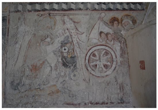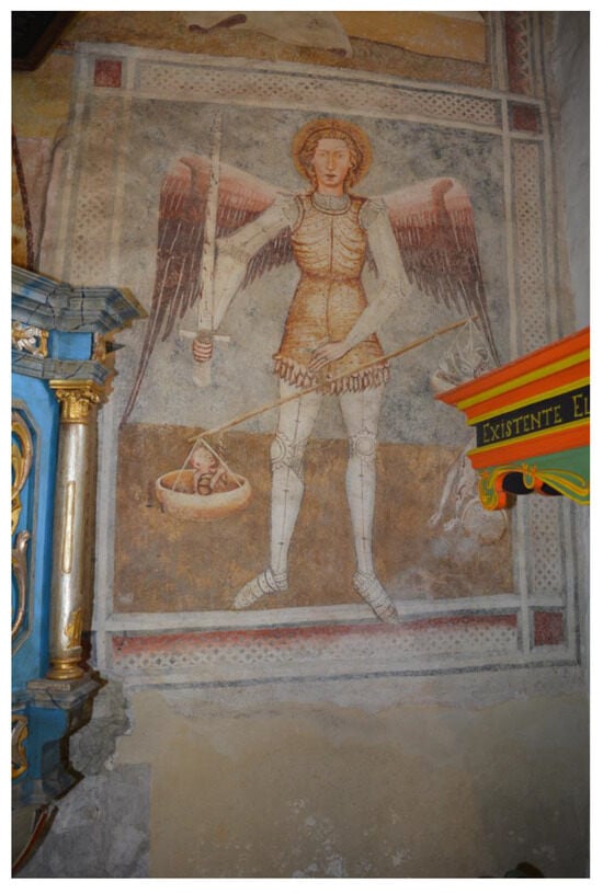 This architectural solution reflects the scriptural and dogmatic principles of their joint cult. The foremost scriptural source might be identified in the Apocalypse (12, 1–8) (Bonnery 1997, p. 18). Based on this biblical source, early on in the Middle Ages, theologians and preachers recognized in the Apocalyptic Woman the Mother of Christ, thus transforming the archangel in her guardian (Bonnery 1997, p. 18). Therefore, the most common and simple justification for their existence side by side in iconography is provided by the passages in John’s Revelation. Nevertheless, one must not forget that the text describes the archangel as leader of the celestial army in his battle against the Devil, and Mary as the Apocalyptic Woman, while the frescoes that are my concern are depictions of Michael in the act of weighing souls and Mary as the protective mother of Christianity. As a consequence, the Revelation of John might be an argument for their conception as an iconographic pair, but these particular painted instances are clues for a more specific use of the visual formula under scrutiny here.