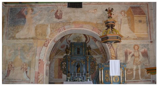 In order to address the relevance of the joining together of the archangel and the Virgin inside the sacred space, a few lines should be dedicated to the presence of Michael and his scales on the surface of the triumphal arch. The sacred space bears in itself a spiritual tension between the nave and the apse, the former being considered a place of struggle for the redemption of the soul, thus being reserved mainly to the laity, while the latter represents the goal of beatific plenitude. The link between the two is determined by the longitudinal axis of the church, which corresponded to the pilgrimage of the human being through life. This itinerary throughout the sacred space is known in the literature as iterus and refers to the physical and spiritual progress of the believer as he walks into the church interior, from the shadow and into the light, from the western part of the nave to the holy light of the apse (Baschet et al. 2012). Without talking specifically about the notion of iterus, Ivan Gerát remarked that in the spatial dynamics of churches from the Gemer area, the triumphal arch played an important part in separating the nave from the apse through the constant use of the Last Judgment or eschatological themes (Gerát 2013).