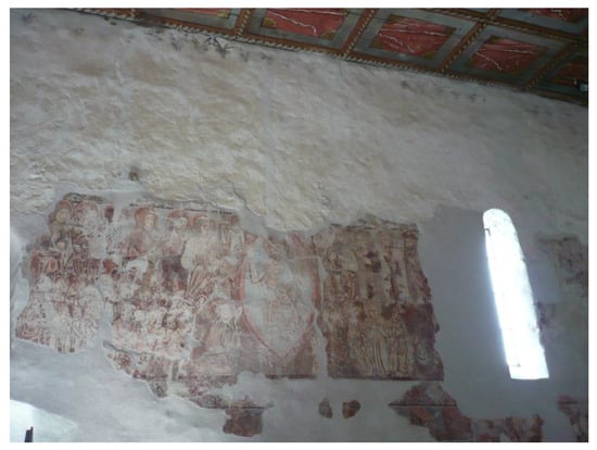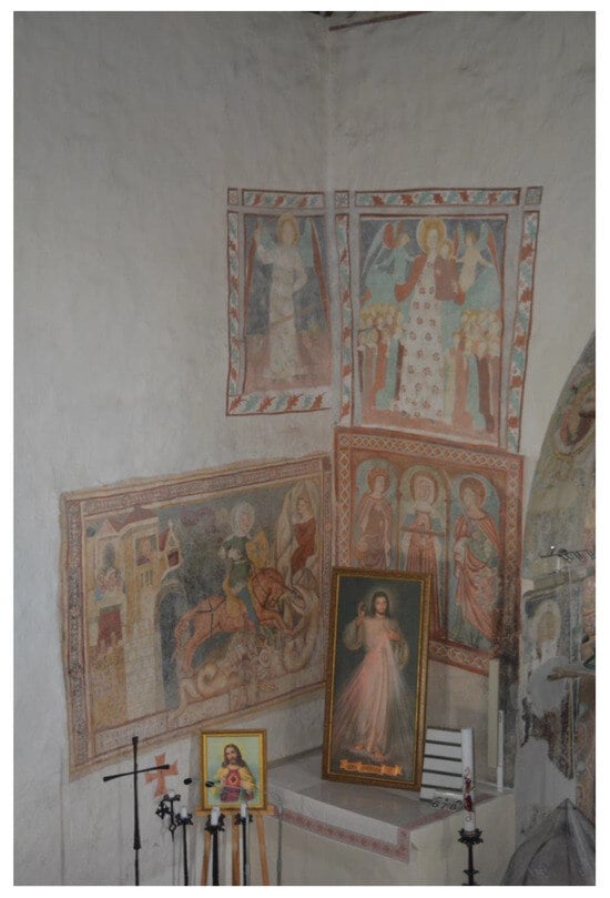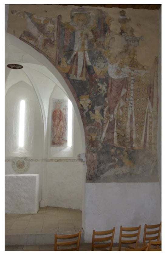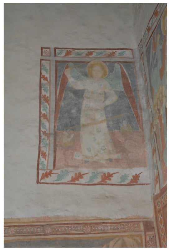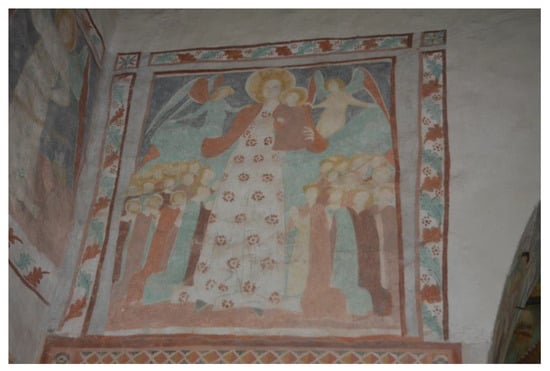 The wall paintings of St Martin’s church in Čerín (Figure 4, Figure 5 and Figure 6) are a less obvious, but equally relevant, example of the spatial placing of images that I am analyzing (Jékely 2021). The northern half of the triumphal arch preserves two murals. In the lower register Saints Dorothy, Helen, and Catherine were depicted, whereas the upper register is dedicated to an image of Mary with the mantle. Next to the Virgin, on the surface of the northern nave wall, St Michael was represented holding the scales of Judgment (Jékely 2021, pp. 231–32; Gombosi 2008, pp. 104, 157). Despite being placed on different walls, the two figures were intended as a mural diptych, to be viewed as a whole, as indicated by identical ornamental band that frames both images and which differs from the one used for the images of St George, on the lower register of the northern wall, or the three female saints previously named.