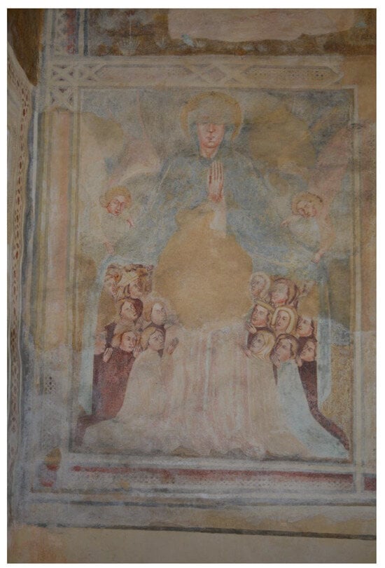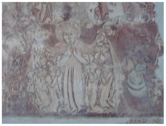 Mary’s cloak, aside from the protection granted to the faithful, acts as a devotional, non-narrative image that reminds the viewer of the Virgin’s role for the fate of the deceased in the Afterlife. Medieval writings remind of her utmost efficacious interventions when it comes to shortening the time of purgatorial penance and, sometimes, of its miraculous redemption of souls that are convicted to the eternal flames of hell14. That this iconographic couple had eschatological implications can be observed in the rather uncommon placing of the two inside the Last Judgment scene in the late fourteenth-century frescoes from the church in Chilieni (Figure 9 and Figure 10) (Hung. Sepsikilyén) (Jékely and Kiss 2008, pp. 278–334). The hell zone is lost, but one can notice near the figure of the Protecting Virgin, the remnants of what appears to have been the scales of the archangel. Therefore, it seems to appear that Mary and Michael were revered as a most powerful couple when it came to one’s fate in the Afterlife and in the moment of the Judgment.