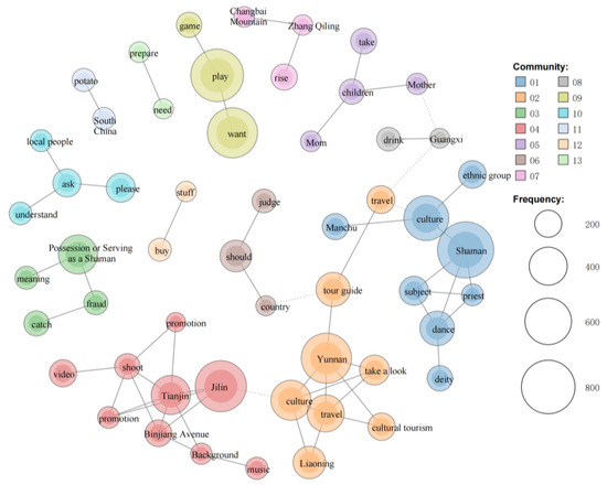 Figure 4). This suggests that the corpus related to “subject” has a certain centrality and high-frequency interaction in the text network, possibly forming a specific semantic link with “Shaman”. In contrast, although nodes such as “culture” and “priest” also carry significant weight in the semantic network, their meanings are more conventional and widely distributed across different contexts, making it difficult to reveal unique thematic features. The prominence of the “subject” node may reflect a more specific textual theme, potentially involving unique narrative logic, symbolic systems, or social practices, thus providing an opportunity to explore the deeper structure within the corpus. Therefore, by combining community detection in the network, this section focuses on the analysis of comments related to the “subject” node, examining its co-occurrence pattern with “Shaman” and its con-textual meanings to uncover how users discuss human will in Shamanic performance.