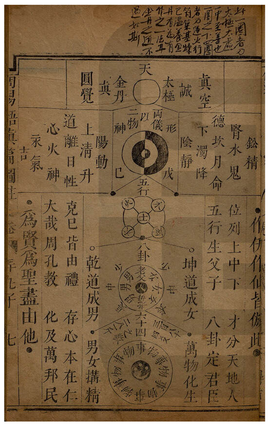 In terms of content, the Illustrated Commentary inherited the alchemical cosmological model transmitted through Chen Tuan’s Wuji Tu, incorporated elements from Zhou Dunyi’s Taiji Tushuo, and meticulously systematized the alchemical principle of “Mundane Continuation vs. Alchemical Inversion” (順凡逆仙, conforming to the ordinary leads to mortality; reversing the ordinary leads to immortality). The way Daoists travel in the world thus runs in two directions, unlike the way of the cosmologists, not only from the Dao to multiplicity, following the unfolding of the world (shun 順, lit., “continuation”), but also from multiplicity to the Dao, in a reverse order (ni 逆, lit., “inversion”) that Daoism calls “return” (fan 返). Simultaneously, it refined and reworked the cultivation doctrines of the Wei Boyang–Peng Xiao–Zhang Boduan lineage, developing a distinct theoretical character ultimately expressed through diagrams. Compared to earlier alchemical texts, the Illustrated Commentary’s pivotal contribution lies in elevating the application of Zhouyi symbolic numerology (周易象數) within alchemical theory to unprecedented sophistication.