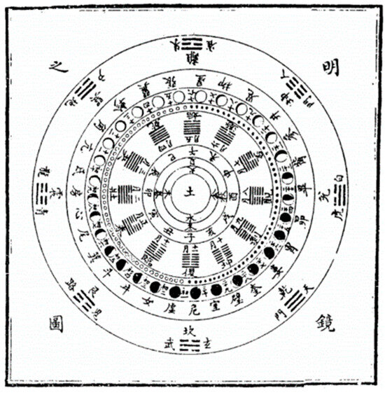On the other hand, regarding the alchemical Yijing diagrams in the Illustrated Commentary, their greater significance lies in being the outcome of the inherent logical evolution of alchemical Yijing studies. The Eastern Han text Cantongqi employed the theoretical core and symbolic systems of Han-era Yijing studies, such as the Najia Theory (納甲說) (Zhan 1984), to outline the framework of alchemical practice. During the Five dynasties period, Peng Xiao 彭曉 (?–955) authored the Zhouyi Cantongqi Tongzhen Yi (Peng 1986, p. 556) and created diagrams such as the Mingjing Tu (明鏡圖, Chart of the Bright Mirror), Shuihuo Kuangkuo Tu (水火匡廓圖, Diagram of Water and Fire in Harmonized Framework), and Sanwu Zhijing Tu (三五至精圖, Chart of the Three-Five Supreme Essence) to elucidate the allegorical meanings of hexagrams, lines, images, and numerological symbols7. The Mingjing Tu explicated the medicinal agents and fire phases (藥物和火候) of alchemy, which were highly valued by Song and Yuan alchemists. The latter two diagrams were incorporated by Chen Tuan into his Wuji Tu (無極圖, Diagram of the Ultimateless). The Wuji Tu used Yijing diagrams to interpret cosmic generation, evolution, and return, directly stimulating the emergence of hetu and luoshu studies in the early Song dynasty. The Wuji Tu was later transformed by Zhou Dunyi 周敦頤 (1017–73) into the Taiji Tu (太極圖, Diagram of the Supreme Polarity).