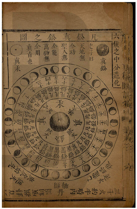 Peng Xiao’s Mingjing tu (明鏡圖, Figure 5) pioneered the use of diagrams to systematically elucidate neidan theory, emphasizing the regulation of huohou (火候, “fire phasing,” or temporal cycles in alchemical practice). Later, Yu Yan expanded this framework by deconstructing each ring of the Mingjing tu into multiple diagrams, yet his work remained within Peng’s original paradigm. The Illustrated Commentary further integrated the theoretical contributions of the Mingjing tu and Yu Yan’s expansions while offering broader interpretive flexibility. By illustrating each verse of the Wuzhen Pian, the Illustrated Commentary not only absorbed existing theories but also advanced them, ultimately constructing a unique neidan theoretical system.