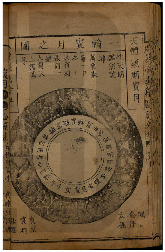 The third category focuses on Chan (Zen) Buddhist gathas (禪宗詩偈) appended to the Wuzhen Pian, emphasizing mind–nature cultivation, such as the Diagram of Qian’s Transformations and the Rectification of Nature and Vital Force (乾道變化各正性命之圖) (Cheng [1611] 1717, Fire Volume, folio 35), Diagram of the Western Pure Land’s Forms (西方極樂色相之圖) (Cheng [1611] 1717, Fire Volume, folio 42), Diagram of the Precious Moon Wheel (一輪寶月之圖) (Cheng [1611] 1717, Soil Volume, folio 22), and Diagram of Mind-to-Mind Transmission (心心相授之圖) (Cheng [1611] 1717, Fire Volume, folio 44). This category culminates in cosmic–alchemical diagrams (e.g., Diagram of the Precious Moon Wheel) that not only signify the completion of minggong 命功 (Vital Force cultivation)—marked by the stabilization of essence (jing 精) and consolidation of primal qi (元炁) through cyclical fire-phasing (huohou 火候)—but also delineate the ontological pivot toward xinggong 性功 (Inner Nature cultivation). Here, the perfected elixir (jindan 金丹), symbolized by the moon’s full luminosity, transitions the adept from refining bodily substances to dissolving cognitive constructs (shishen 識神). The Diagram of the Precious Moon Wheel will receive focused analysis below as a key example of visualizing the merging of cosmic and corporeal substances.
