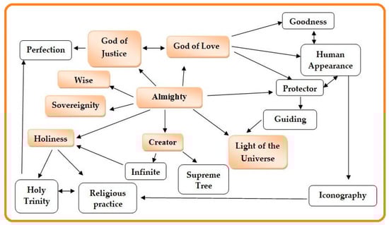 The most significant category is Absolute Superiority of God, with a total of 105 graphic and textual codes and the following subcategories: all-powerful, creator, holy, guide, sovereign, wise, infinite, perfect, trinitarian, eternal, inconceivable, omnipresent, all-sustaining, and invisible. The next category is God of Love, with 70 codes and the following subcategories: God’s love, protection, goodness, gentleness, mercy, forgiveness, and patience. Far behind these, we identified a group of categories with a similar number of codes: Religious Practice, with 19 codes and the subcategories Church, prayer, and cult of the dead; God with Human Appearance, also with 17 codes and the following subcategories: long beard, long hair, powerful penetrating eyes, smiling, male, with traces of wounds, elegantly dressed, and thin; God of Iconography, with 17 codes and the following subcategories: the cross, angels, halo, and the Trinity; and God of Justice, with 16 codes and the following subcategories: divine justice, testing of people, and free will. The other two categories are Light of the Universe, with nine codes and the following subcategories: the sun, vision, and presence of God, and the Supreme Tree, with two codes.