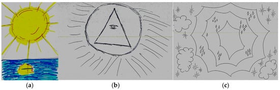 Representation of the divinity as the Light of the world by final-year students of the vocational high school of Orthodox theology: (a) P8/F; (b) P7/M; (c) P14/F.