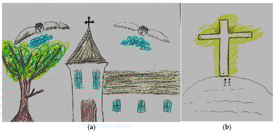 Representations of the church and the cross by final-year students of the vocational high school of Orthodox theology: (a) the church/P21/M; (b) the cross as a “symbol of salvation” (P26/M).