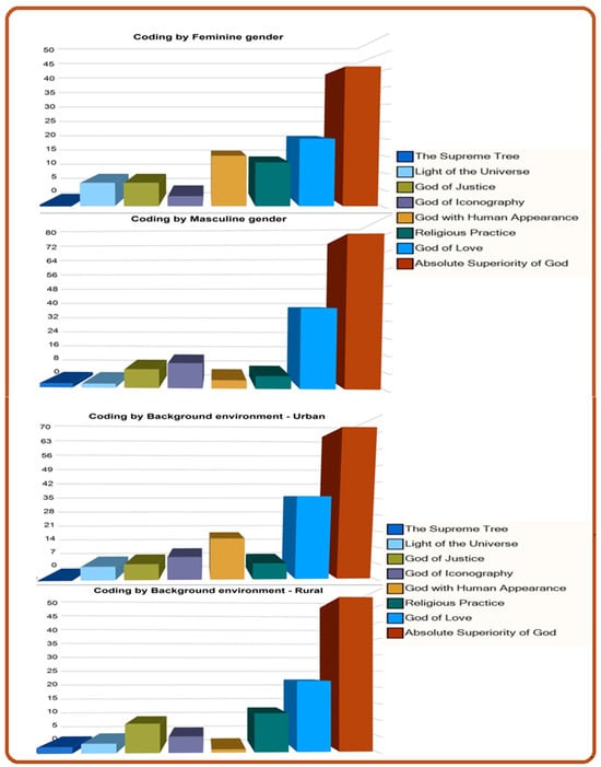 The background environment also determined the differentiation of representations at a secondary level, after similar primary options for Absolute Superiority of God (65U and 48R) and God of Love (36U and 22R). In the case of urban respondents, at the secondary level, interest is directed toward God with Human Appearance (18U and 1R), while for rural respondents, this interest is directed toward the categories Religious Practice (7U and 12R) and God of Justice (7U and 9R). This differentiation might be an expression, on one hand, of the realism of urban dwellers, such as their tendency to transform everything into measurable things (), and, on the other hand, of the habit of Romanian rural dwellers to rely only on their actions when calibrating their expectations. Figure 8 represents cumulatively by gender and background the distribution of codes for the main categories resulting from the open coding of the drawings and explanations of the student respondents.