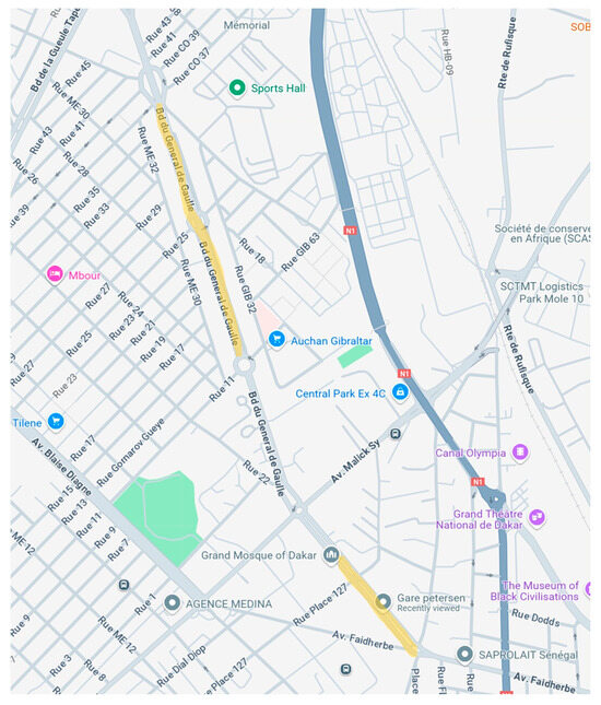 A map of Dakar highlighting Gare Petersen (lower) and Boulevard Général Charles de Gaulle/Allées du Centenaire (upper). Google Maps. 26 June 2025.