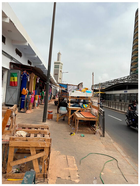 Chinese-owned shops in Dakar initially were concentrated around the Gare Petersen (see Figure 2). Chinese owned more than 90% of the shops in this small commercial center designed for Senegalese vendors (Scheld 2010, p. 153, see Figure 3). They later expanded to the nearby area of Centenaire (Boulevard Général Charles de Gaulle, commonly known as “Allées du Centenaire”, see Figure 4), which earned its name of Chinatown or “Henan Street”. The emergence of Dakar’s Chinatown is embedded in the political economy of the host country and is the result of organically growing Chinese shops, rather than a deliberately designed space as seen in the Dubai Mall (Gu and Song 2024), Costa Rica (Monica 2015), and Lagos (S. Liu 2019).