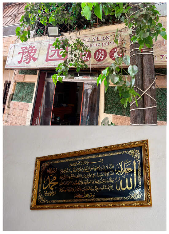 Henan people’s language skills helped to facilitate their encounters with locals who are their business partners, clients, landlords, as well as young migrant workers from neighboring countries such as Guinea (Seck 2014, p. 138). Sometimes, the relationship between Senegalese street vendors and Chinese shopkeepers can be intensive (Interview, 21 April 2025). But I also witnessed a Senegalese street vendor sitting in the shop and chatting casually with the Chinese shopkeeper (Fieldnotes, 11 December 2022), a scene that supports the friendly relationships observed by other scholars (Scheld and Siu 2014, p. 173). Scheld and Siu (2014, p. 160) also pointed out the presence of “veiled racism” in Dakar’s Chinatown, noting that under “smiles and superficial acts of kindness,” the Chinese often held racist attitudes toward Senegalese, while Senegalese expressed xenophobic sentiments. It is in this setting that religious connections and misunderstandings have played an important role in shaping Chinese Hui Muslims’ perceptions of local Muslims.