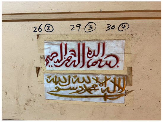 A closer examination of the linguistic and semiotic landscape of Dakar’s Chinatown helps to revel its Muslim background. Many of these shops sell modest clothing or hijabs for Muslim women on the east side of the road. In the picture below, the shop is branded as “Mohamed Pan,” a Muslim first name and Chinese family name indicating his Chinese Muslim background (Figure 5). On Google Maps, a Chinese hair salon was named after “Ayisha,” which clearly is a Muslim female name. One family who originally came to Dakar as businesspeople opened a halal restaurant serving Henan food in 2021 (Fieldnotes, 11 December 2022), and their menu below has a green label in the upper right-hand corner reading qingzhen (lit. pure and true) in Chinese and taʿām almuslimīn (lit. food of the Muslims) in Arabic, which advertises the restaurant as a halal one (Figure 6). Another Henan restaurant, “Yuyuan,” opened in 2024 in an alley off Centenaire Street, has attracted many customers from Zhuxian Town. In this small restaurant, two plaques featuring the Arabic basmala (“In the name of God, the Most Gracious, the Most Merciful”) are placed above the door frame of the halal Henan restaurant. Inside the restaurant, alongside Chinese painting decorations, a larger plaque displaying the shahada (“There is no god but God, Muhammad is the Messenger of God”) and Quranic verse (2:255)1 is mounted on the wall (Figure 7). Similarly, inside a Chinese shop, a small plaque with the Arabic basmala and shahada is affixed to the door of the garage room (Figure 8).