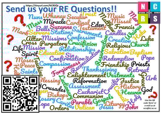 An invitational poster was made with a prompting word-map of as many RE words as the author could muster at the time, such as: Saints, Mass, Jesus, God, Heaven, Relationships, Gospel, etc., and a heading saying, “Send us your RE Questions!!” A QR code linking to a URL for a Google form, which was also present as an easily typed ‘tinyurl’, was included, along with the NCRS logo (See Figure 1). A short e-mail was sent to all Aotearoa NZ Catholic schools asking teachers to put the poster in prominent places and encourage students to send in their questions.