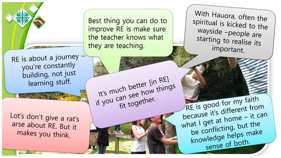 Myriad comments, such as capacity of teachers, desire for interactive discussion, and inclusion of learning about other faiths, align with the student voice research of () and have merit as such. However, a focus for the author was capturing phrases and nuances which could be used both as a point of reflection and direction for developers of curriculum, and also as a reinforcement for particular approaches when shared with bishops, school principals, and RE leaders and teachers.